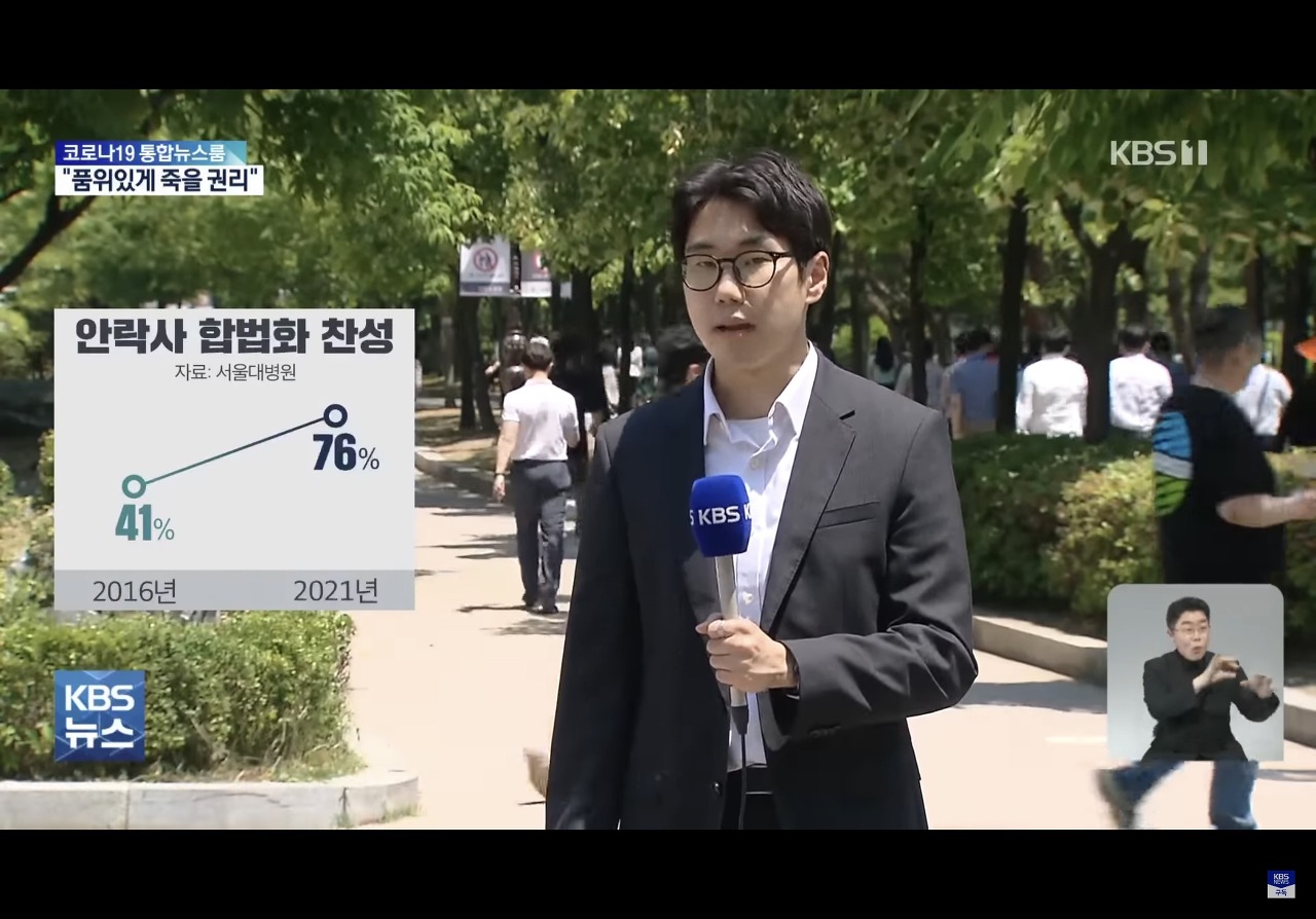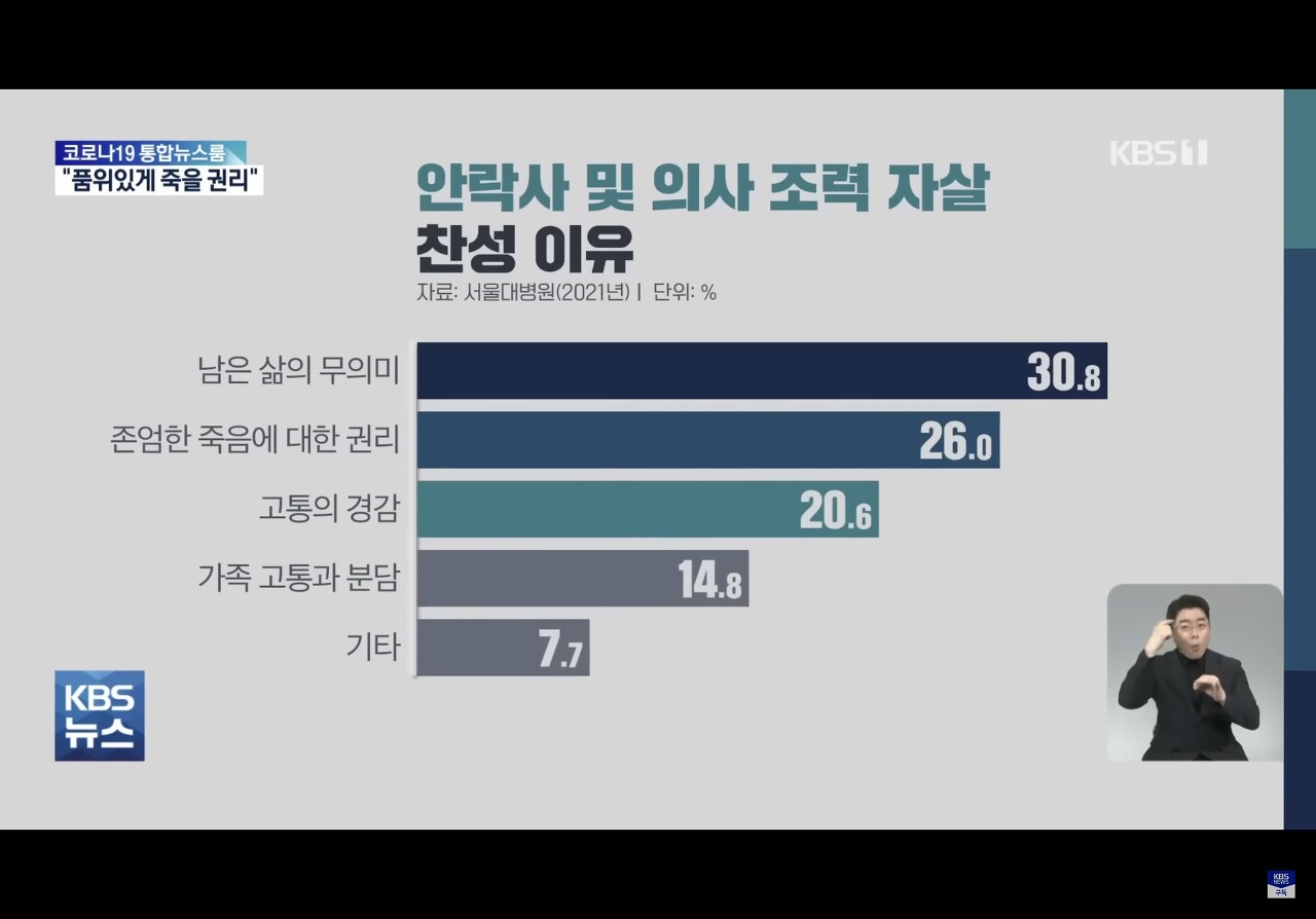 찬성 이유는 1. 삶의 의미가 없어서 2. 인간답게 살다 가기 위해서 라는데...